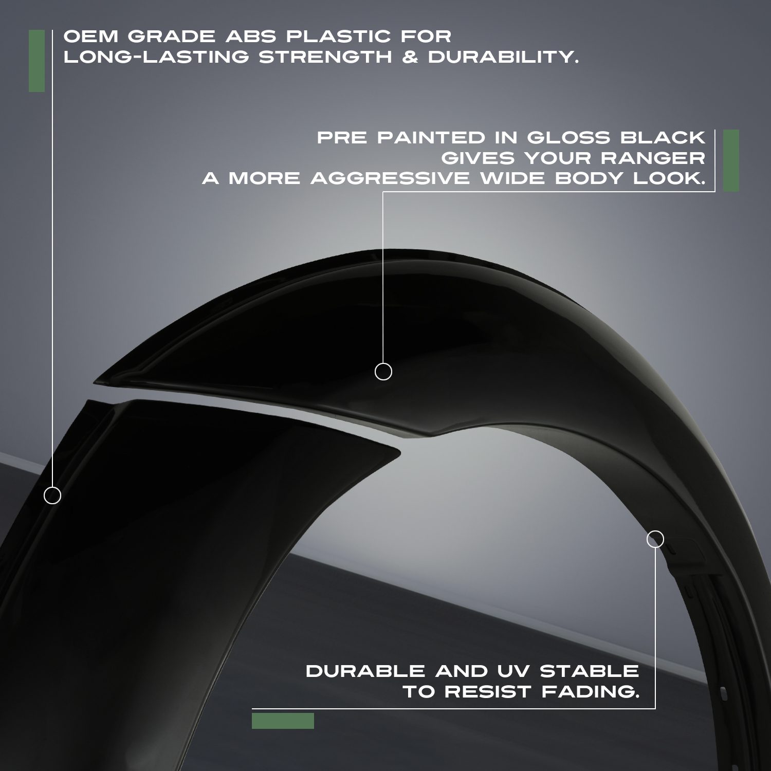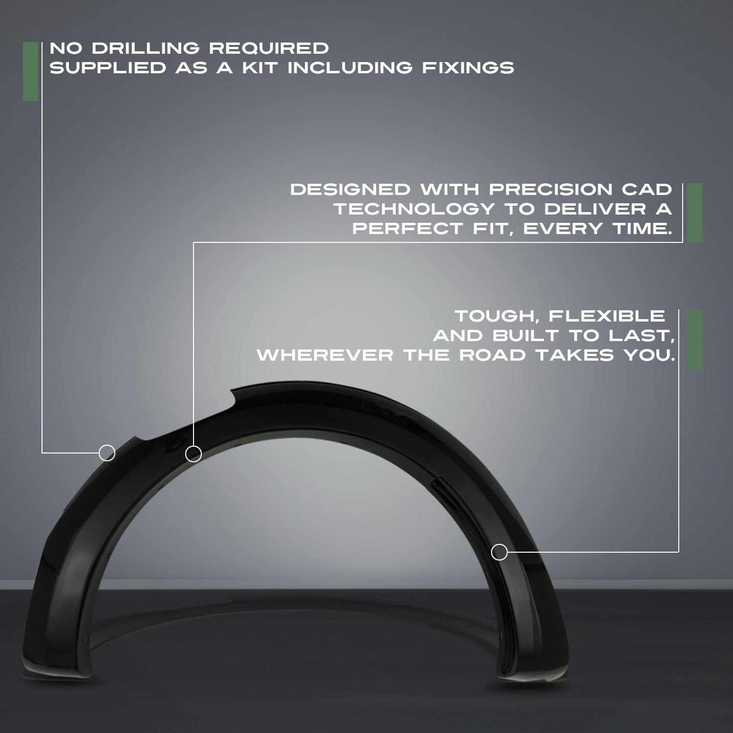 Our fender flares are built from the highest quality ABS plastic, ensuring durability in the toughest conditions. All fender flares are designed using CAD to ensure perfect fitment every time.