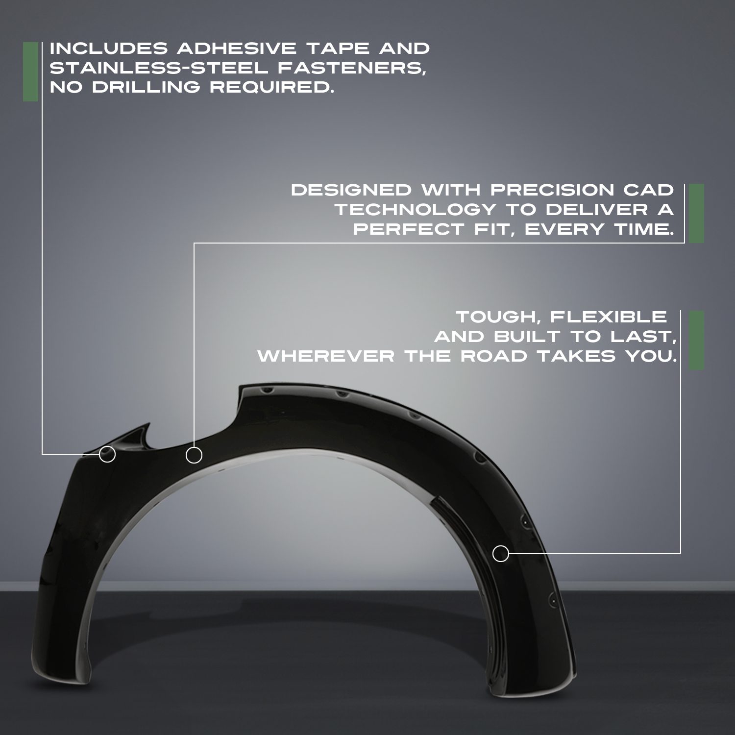 Our fender flares are built from the highest quality ABS plastic, ensuring durability in the toughest conditions. All fender flares are designed using CAD to ensure perfect fitment every time.