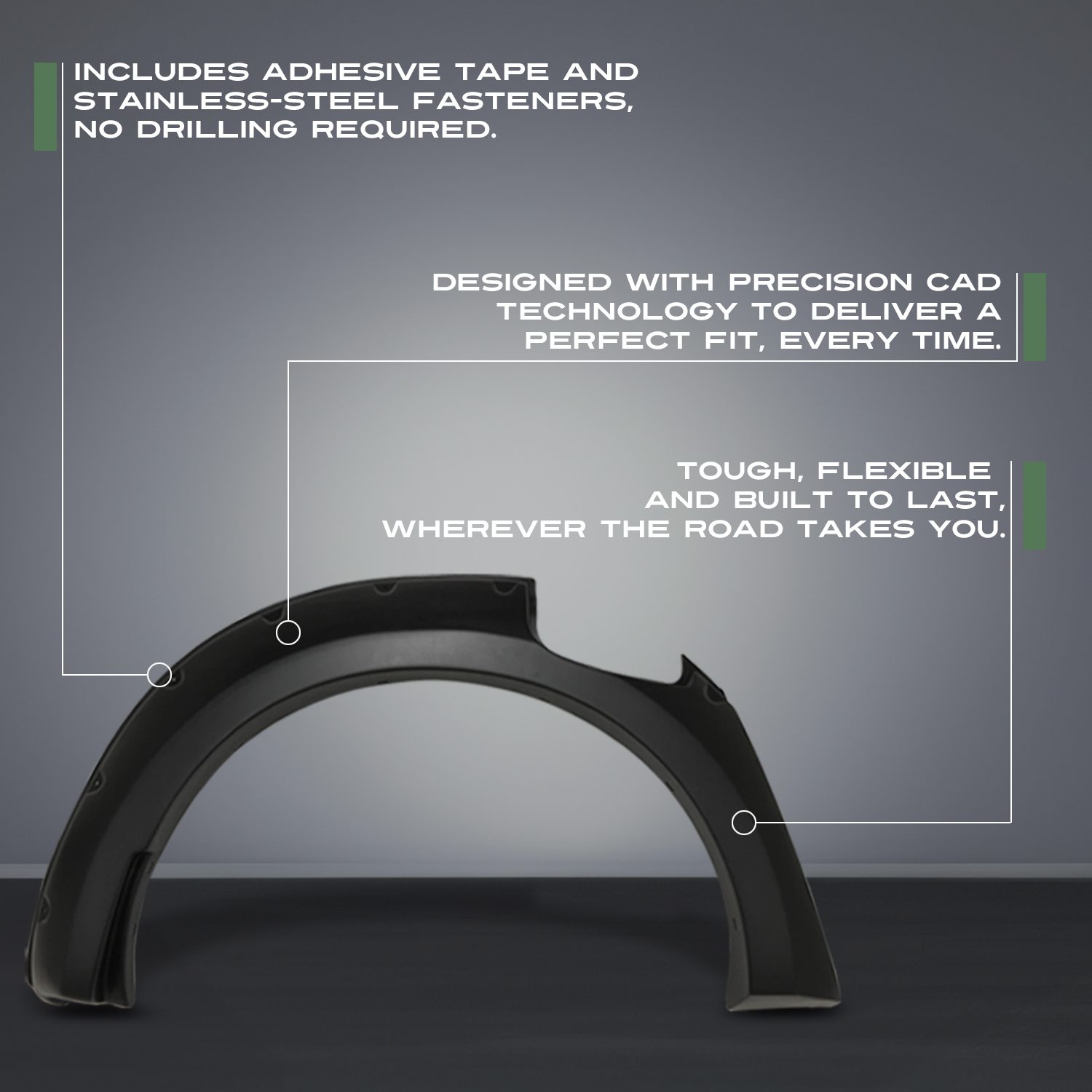 Our wheel arches are built from the highest quality ABS plastic, ensuring durability in the toughest conditions. All fender flares are CAD designed to ensure perfect fitment every time.